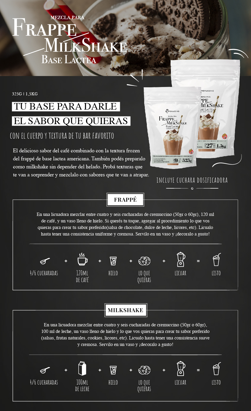 Nuestro Frappé / Milkshake Base Lactea es la forma más rápida y deliciosa de disfrutar una bebida cremosa y refrescante con sabor intenso. Solo necesitás hielo, leche y batir… ¡listo para disfrutar en casa como si fuera de tu cafetería favorita!