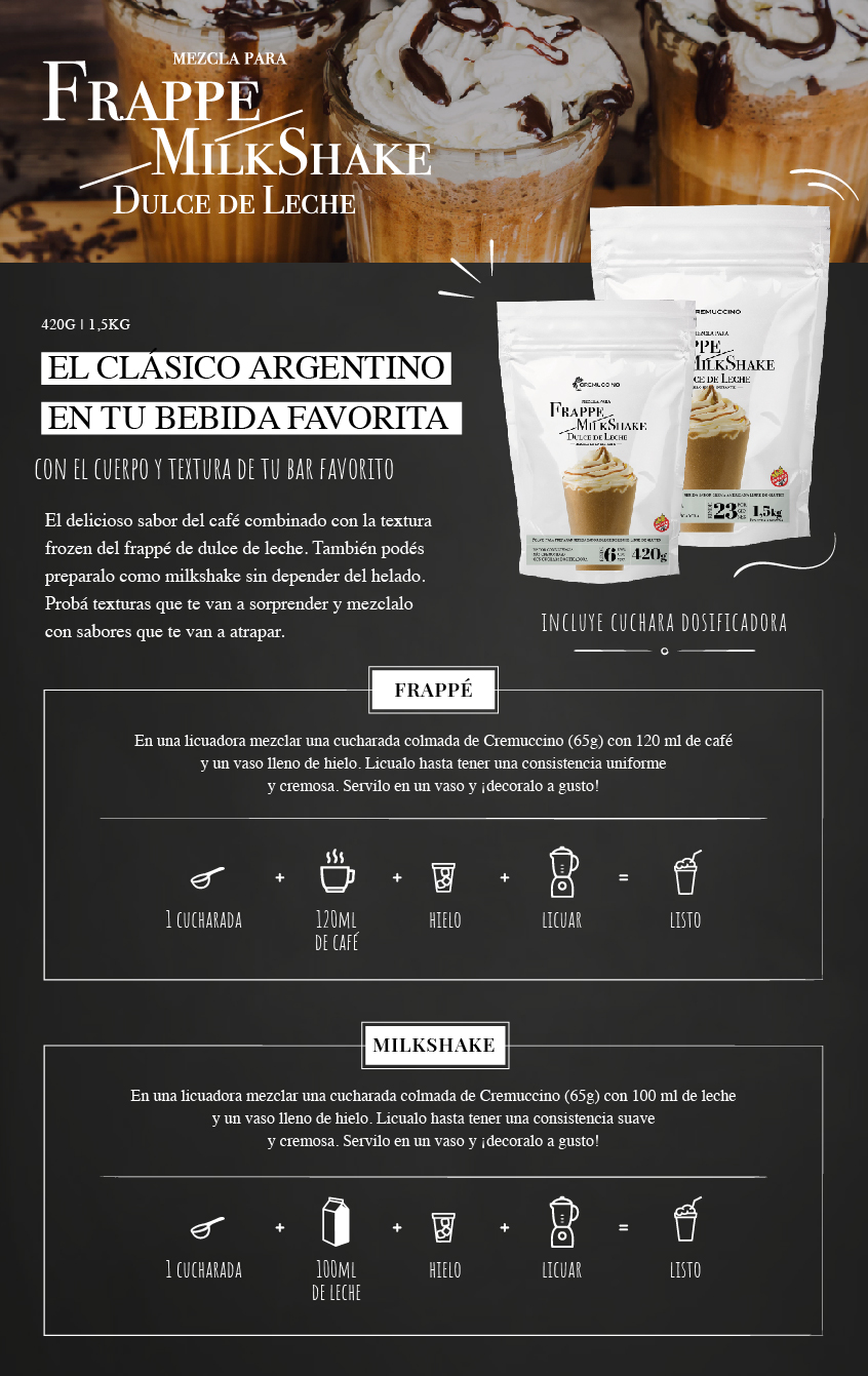 Nuestro Frappé / Milkshake de Dulce de Leche es la forma más rápida y deliciosa de disfrutar una bebida cremosa y refrescante con sabor a Dulce de leche. Solo necesitás hielo, leche y batir… ¡listo para disfrutar en casa como si fuera de tu cafetería favorita!